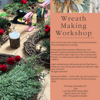 oin us for a cozy and creative evening hosted by Of Love Designs at Luxe Spa Come spend the evening crafting your own beautiful dried and preserved/faux floral wreath. It's the perfect girls' night out, a fun evening with friends, or a relaxing solo night to unwind and get creative